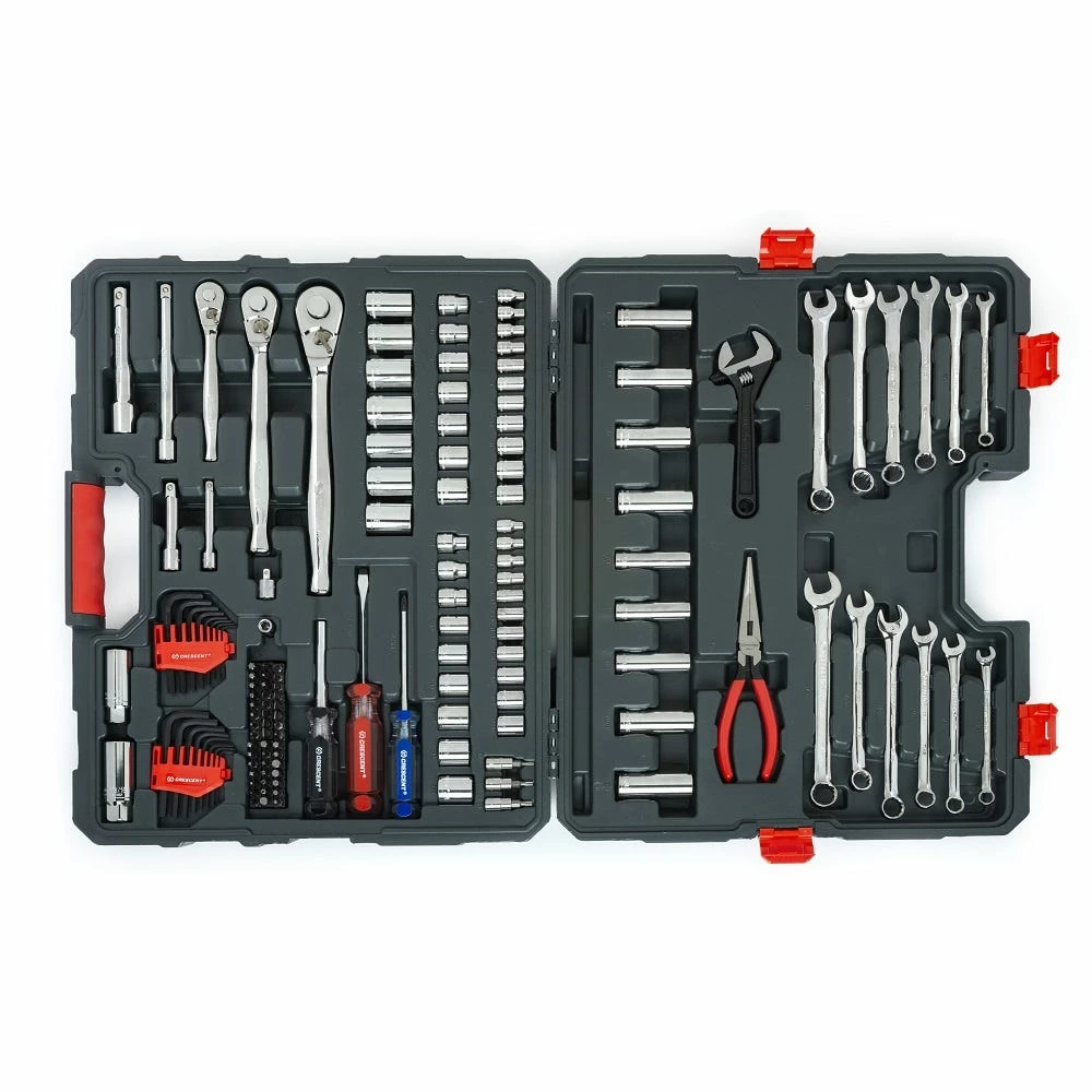 This 150. pc professional tool set includes 1/4″, 3/8″ and 1/2″ drive tools with both SAE & Metric components to tackle a wide range of projects. It contains a carefully selected assortment of hand tools needed for most industrial, mechanical and consumer applications and comes with a blow mold case for handy storage and organization.