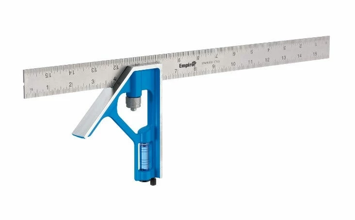 The Empire® 16 in. True Blue® combination square (E280) has precision machined working surfaces and a head with rational dimensions for a quick check of common measurements. The square has the BLADE-LOCK™ self-aligning drawbolt allowing quick adjustments with a secure hold. The DUAL-PITCH™ True Blue® vial allows for easy check for level, one-, and two-degree slope. The 16 in. etched stainless steel blade will not fade over time and has high-visibility markings. The Combo square also has Onboard storage for a hardened scriber.