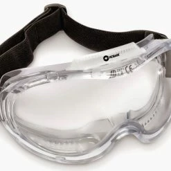 Goggles with form-fitting frames with clear lenses that are made from shatterproof polycarbonate and have a scratch resistant coating.