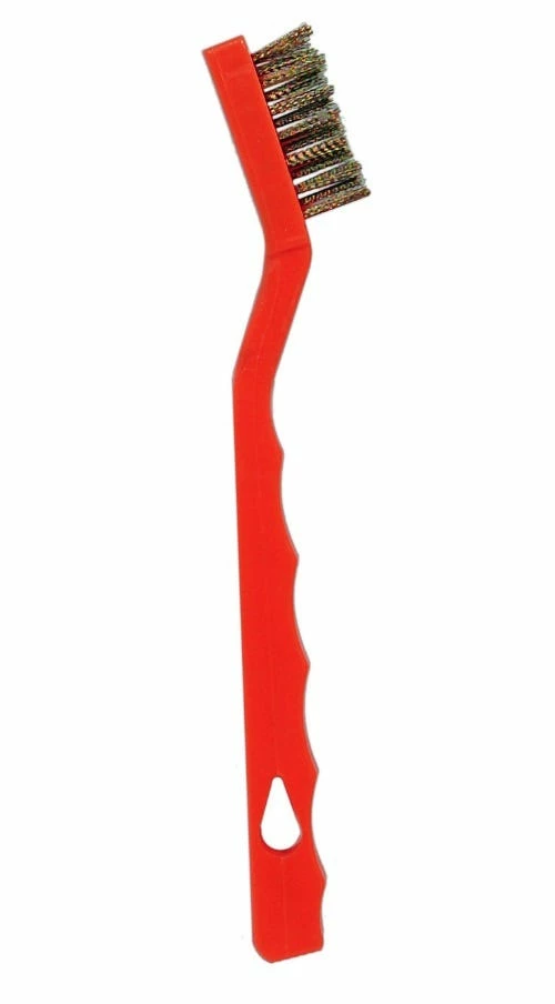 Sturdy, high-quality brass brush with durable nylon, heat-resistant handle. Ideal for removing debris and polishing welds. 7 inch length.