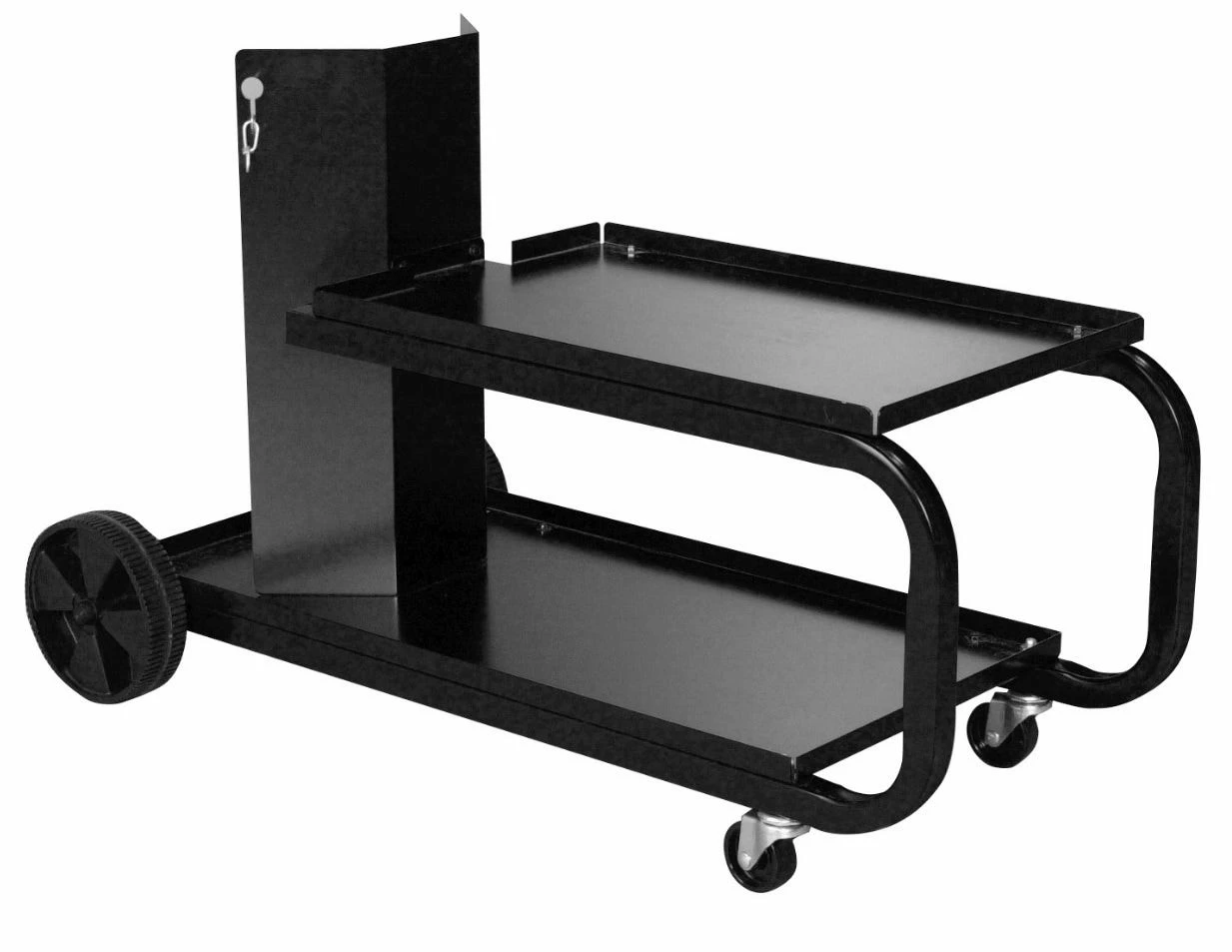Small welding cart is designed to hold most portable welders. Accepts gas bottles up to 7 inches in diameter, maximum 75 lbs. Assembled dimensions: 18 inches high x 30 inches length x 12.5 inches wide. Welder shelf dimensions: 12.5 inches x 19.75 inches. Assembly required.