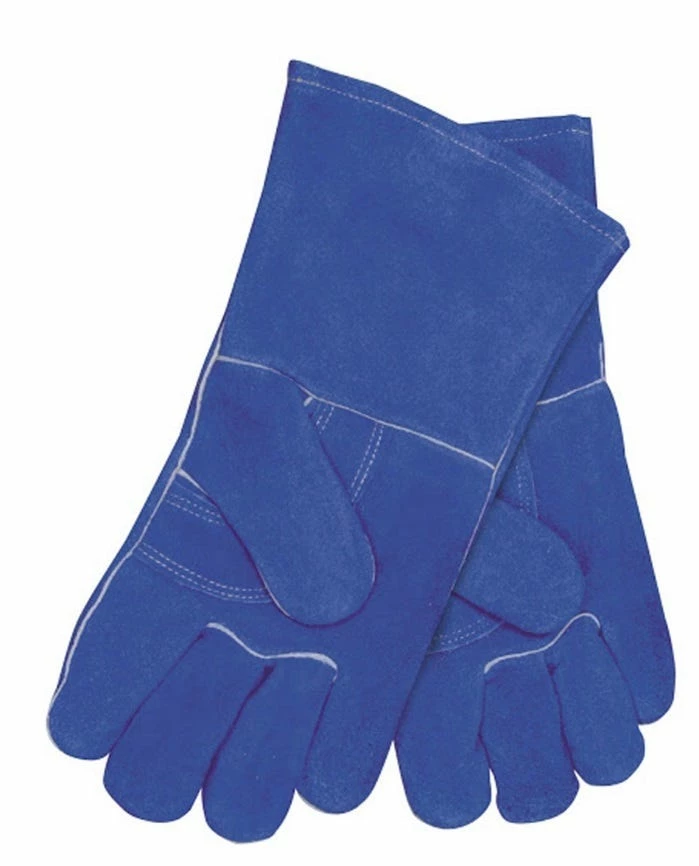 Blue welding gloves are made of select split leather with flame retardant liner and added thumb strap for extended wear in the palm.
