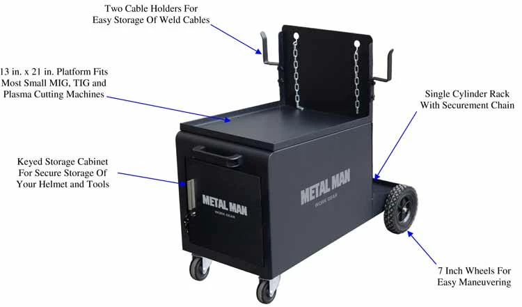 The Metal Man mini welding cabinet helps keep your shop organized by stowing all your welding tools and accessories. It is designed for the welder to sit on top of cabinet, has a 7 1/2in. gas