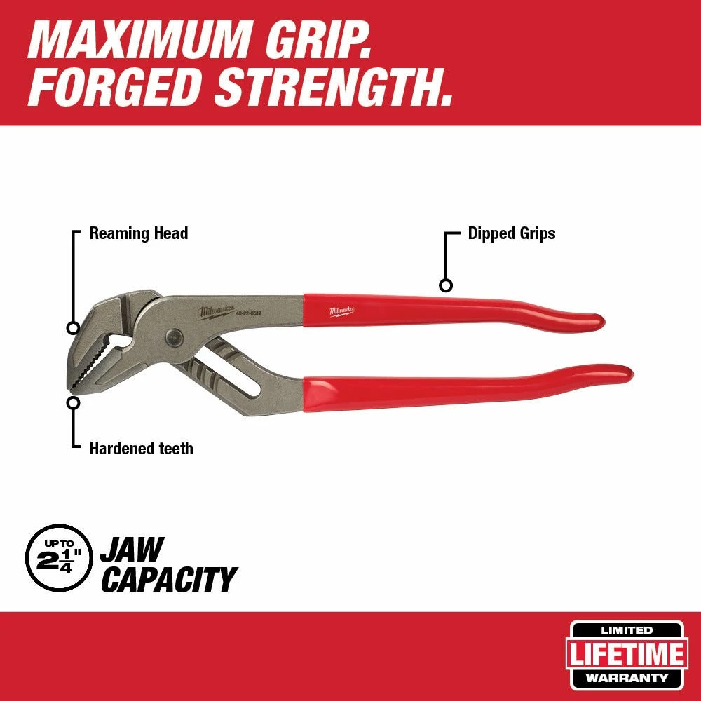 The Milwaukee 12-Inch Straight Jaw Pliers offer Maximum Grip with a Forged Strength Reaming Head. The Straight Jaw Plier’s Teeth are Hardened, giving Users a Secure Grip over the Life of the Tool. The Pliers feature Slim Profile Dipped Grips and are Optimized to Provide Users with Better Comfort and Ergonomics. All Milwaukee Pliers are Forged for Strength and feature Rust Protection with a Limited Lifetime Warranty.