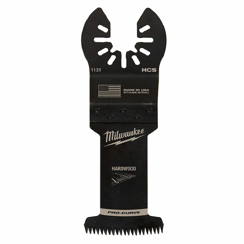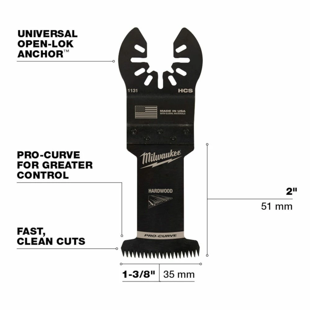 The MILWAUKEE® UNIVERSAL FIT OPEN-LOK™ 1-3/8″ HCS Japanese Tooth PRO-CURVE™ Hardwood Blade 3 Pack for Oscillating Multi-Tools is made from premium high carbon steel. This hardwood multi-tool blade has precision triple ground Japanese teeth and now includes PRO-CURVE™ for greater control and accuracy. This is Milwaukee’s best multi-tool blade for making precise cuts with a smooth finish in hardwood and can also be used in other woods, PVC, drywall, and other soft materials. This Milwaukee blade delivers up to 2X faster cuts than the previous generation of high carbon steel blades with a deeper plunge cut and a wider 1-3/8″ cutting width. This multi-tool blade is designed and made in the USA with global materials.