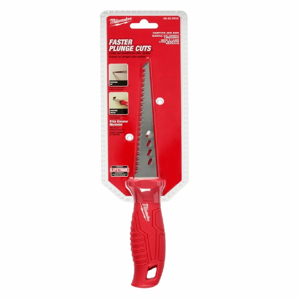 Our Rasping Jab Saw is the only jab saw on the market to integrate rasping holes along the side of the blade to rapidly expand holes or smooth rough edges of sheetrock after a cut has been made. Complete with ribbed indentions to increase handle grip, the new jab saw also features a thick 6” plaster/drywall blade for increased durability and life. The piercing tip makes this tool is ideal for penetrating drywall, and the blade allows you to cut plaster with ease. With a tether-ready lanyard hole and anti-roll handle, the MILWAUKEE® Rasping Jab Saw is perfect for contractors and builders.