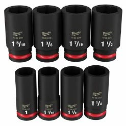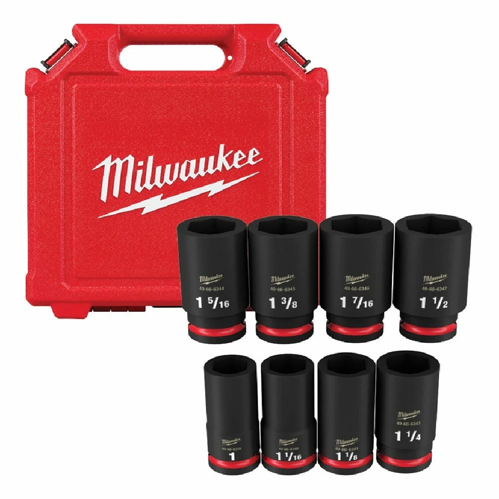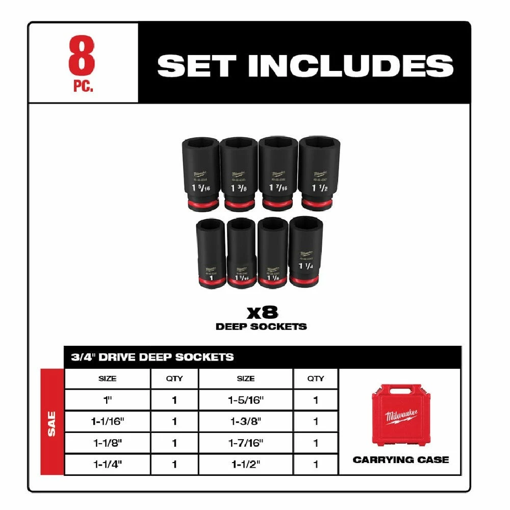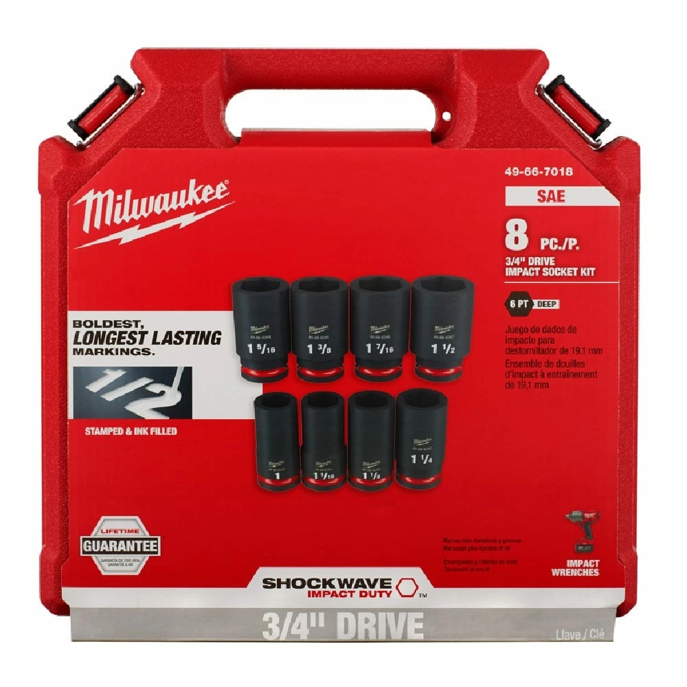 The Milwaukee 8-Piece SHOCKWAVE Impact Duty 3/4 in. Drive SAE Deep 6 Point Socket Set features the boldest, longest-lasting markings and extreme impact durability in high torque applications. The stamped and ink-filled size marking enables users to select the right socket every time throughout the life of the socket. These Milwaukee sockets are engineered with high strength forged steel for optimized performance in heavy-duty applications. The non-slip hex geometry prevents fastener rounding, and a dual-hole design and ring groove allow for easy socket attachment and removal. The storage cases are impact resistant and nest together for easy stacking and storage. All SHOCKWAVE Impact Duty Sockets backed by a Lifetime Guarantee and meet ASME industry standards.