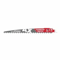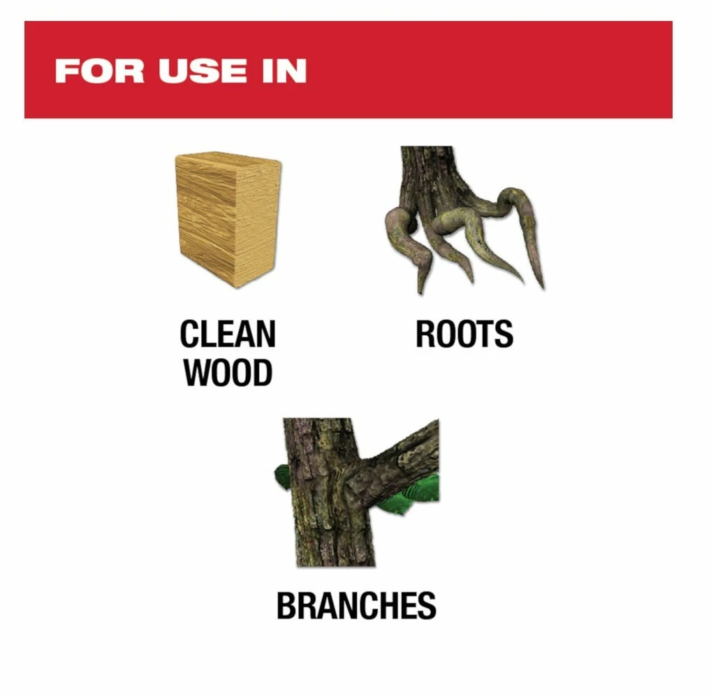 Our AX™ with Carbide Teeth SAWZALL® Blades for Pruning & Clean Wood are designed for the fastest above and below ground cutting applications. These SAWZALL® pruning blades offer up to 50X more life vs. carbon steel reciprocating saw blades available today. The MILWAUKEE® AX™ blades for pruning and clean wood cutting offer a 3 TPI design, which allows for the fastest cutting in clean wood, and a low profile blade geometry designed for root removals. Our optimized carbide teeth withstand abrasives like rock, sand, and dirt as users remove roots for trenches or stumps for tree removals. Milwaukee carbide teeth products allow you to cut longer, cut more, and cut faster than other carbide-teeth blades on the market.