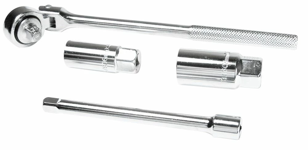 - Heat treated alloy steel. 3/8″ dr ratchet, 6″ extension, 5/8″ and 13/16″ spark plug sockets.