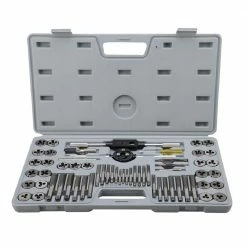 Tap and dies: 3×0.5, 4×0.7, 5×0.8, 6×1.0, 7×1.0, 8×1.25, 9×1.25, 10×1.0, 10×1.5, 12×1.75, 4-40, 6-32, 8-32, 10-24, 10-32, 12-24, 1/4-20, 1/4-28, 5/16-18, 5/16-24, 3/8-16, 3/8-24, 7/16-14, 7/16-20, 1/2-13, 1/2-20, 1/8NPT27