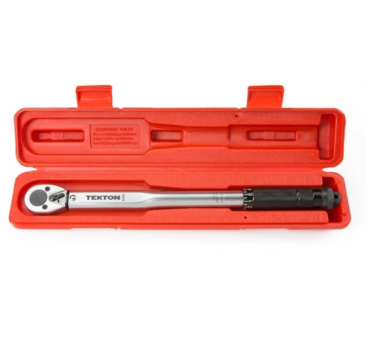 Calibrated to an accuracy of +/- 4%, the TEKTON 3/8 in. Drive Click Torque Wrench lets you work with confidence, eliminating guessing and the common tendency to overtighten fasteners. Correctly tightening fasteners to a vehicle or equipment manufacturer’s torque specifications ensures parts are properly secured without being damaged. Simple and easy to use, this wrench has a reversible ratcheting head that drives fasteners in both directions and measures torque in the clockwise direction. To measure torque, set the desired value on the handle scale (foot pounds or Newton meters) and begin tightening the fastener. When the preset torque value is reached, a reliable mechanical operation inside the handle produces a click you can hear and feel, alerting you to stop applying force. Built for consistent performance and years of dependable service, the mechanical design doesn’t need batteries, and the all-steel construction has no plastic parts to break or wear out. IMPORTANT: This wrench is shipped pre-calibrated and ready to use. To help maintain calibration, store at its lowest setting of 10 ft.-lb./13.6 Nm when not in use. Be sure to read and understand the operator’s manual, including all safety information, before first use.