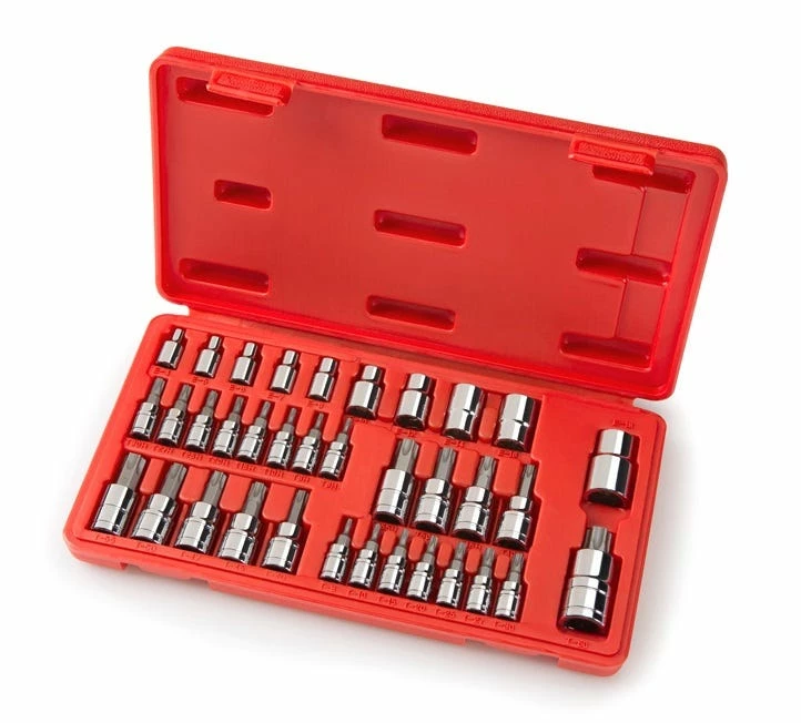 Star and tamper star bit sockets and rare external star sockets are all brought together in one place in the TEKTON 35-pc. Star Drive Bit Socket Set. With a full range of sizes in each type, this is a unique collection for specialized auto and machine service and repairs. Whether you are replacing or adjusting headlights, replacing seat belt anchors, servicing brake calipers or replacing pads, this set has what you need. High-strength chrome vanadium steel sockets have a durable corrosion-resistant chrome plated finish. Premium hardened S2 steel bits are precisely machined for exact fit in fastener head. Each socket features a notched drive end to lock onto drive tang, preventing it from sticking in fasteners or falling off in some deep, dark place. Slim storage case keeps everything organized, saves toolbox drawer space, and is easy to carry to the job.